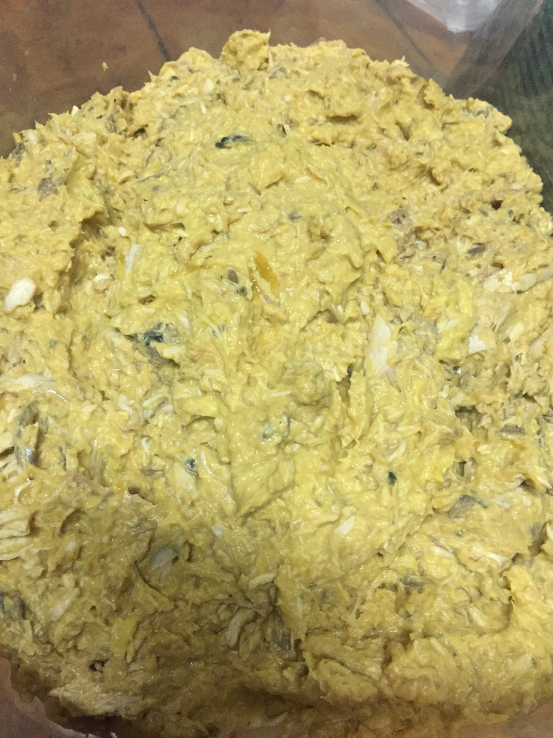 ุ6)นำไก่และฟักทองที่ต้ม ไว้มาปั่นจนละเอียดค่ะ และนำปลาซาบะที่แกะไว้มาคลุก ให้เข้ากัน