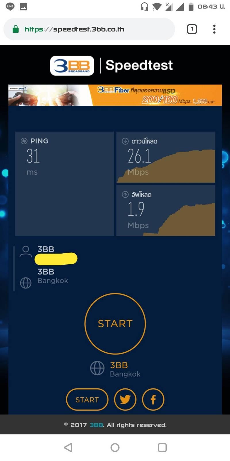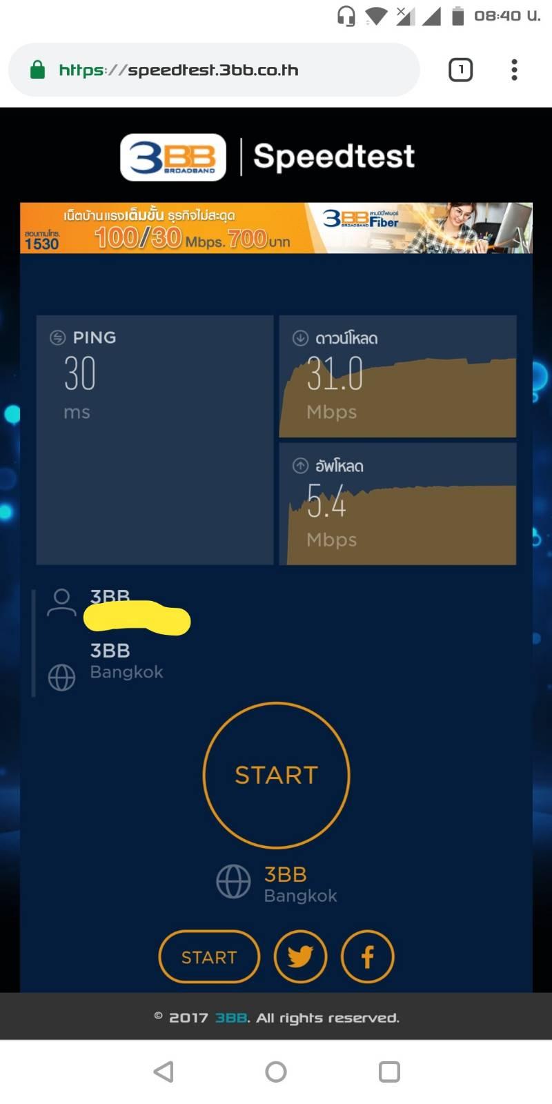 ผมสังเกตเห็นอินเตอร์เน็ตของผมช้าบ้างเร็วบ้างที่ใช้โทรศัพท์ เลยลองเอาเครื่องที่สองมารองก็ยังเหมือนเดิม เลยโทรสอบถาม 1530 เจ้าหน้าก็บอกว่าความเร็วอินเตอร์เน็ตถึงเร้าเตอร์ ปกติ 30/10 และแนะนำให้เข้าไปเซ็ดความที่เว็บของ 3BB โดยตรงทำการเซ็ดไป 5 รอบ