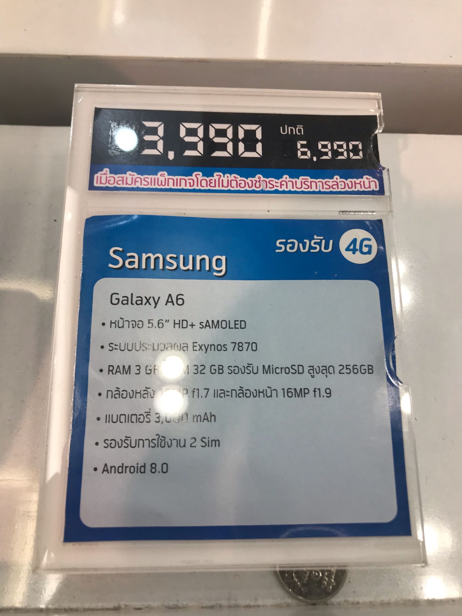 ผมได้ซื้อเครื่อง Samsung A6 ราคา 6990โดยใช้สิทธิ์ย้ายค่าย ได้ส่วนลดราคา 3500 บาท เหลือ 3490