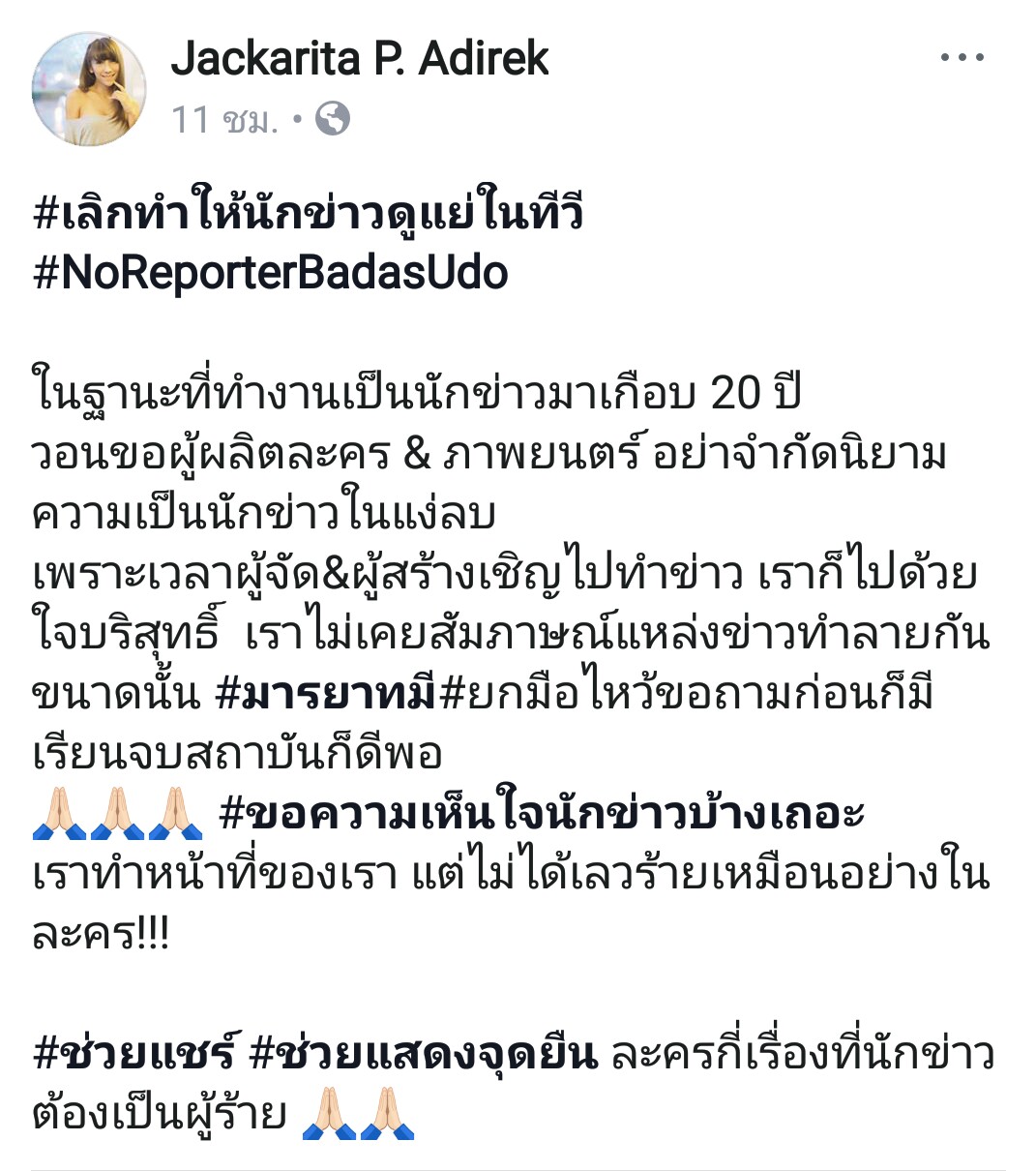 ไม่เข้าใจว่าแจ็คการีนมองไม่เห็นมุมนี้ของพวกนักข่าวจริงๆ ดิ แจ็คการีนเป็นนักข่าวบันเทิงที่ดีนะในความคิดเรา แต่มันไม่ใช่ว่าตัวเองดีแล้ว คนอื่นจะดีเหมือนตัวเองหมด ทุกอาชีพมีทั้งคนดีและไม่ดีปะปนกันไป อยู่ที่ว่าองค์กรนั้นๆ จะแสดงด้านไหนออกมาให้เห็นมากกว่าเท่านั้นเอง ก็เหมือนกับอาชีพตำรวจ ข้าราชกาลในบ้านเรานั่นละ ที่คนมองภาพรวมว่าแย่ เพราะขยันแสดงแต่เรื่องแย่ๆ ออกมาให้ประชาชนเห็น แทนที่จะมาโทษละคร เรียกร้องความเป็นธรรมให้พวกตัวเอง เราว่าควรไปจัดการผู้ร่วมอาชีพตัวเองให้คนอื่นเขายอมรับดีกว่า เพราะที่เห็นตอนนี้มันไม่ใช่อะ การที่แจ็คออกมาโพสต์ครั้งนี้ดูเกินเรื่องไปนิดนึง