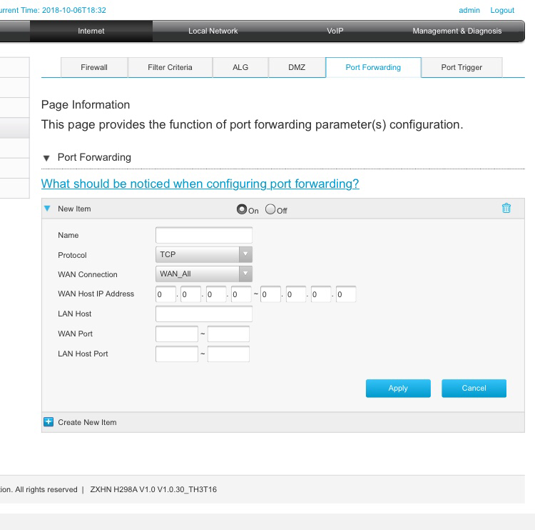 ผมเพิ่งใช้บริการ AIS Fiber ซึ่งเพิ่งติดตั้งไป ต้องการจะทำการ forward port เพื่อให้สามารถเข้าถึง server ที่ตั้งอยู่ที่บ้านได้ ผมได้ router เป็นของ Huawei รุ่น HG8245H ซึ่งก็มีเมนูให้ทำ port forwarding