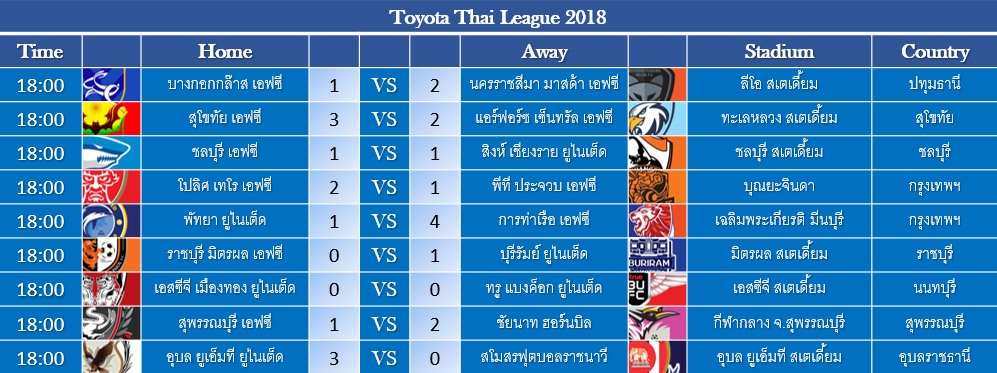 สรุปผลฟุตบอล ไทยลีก 2018 ประจำวันอาทิตย์ที่ 7 ตุลาคม 2561 พร้อมตารางคะแนน