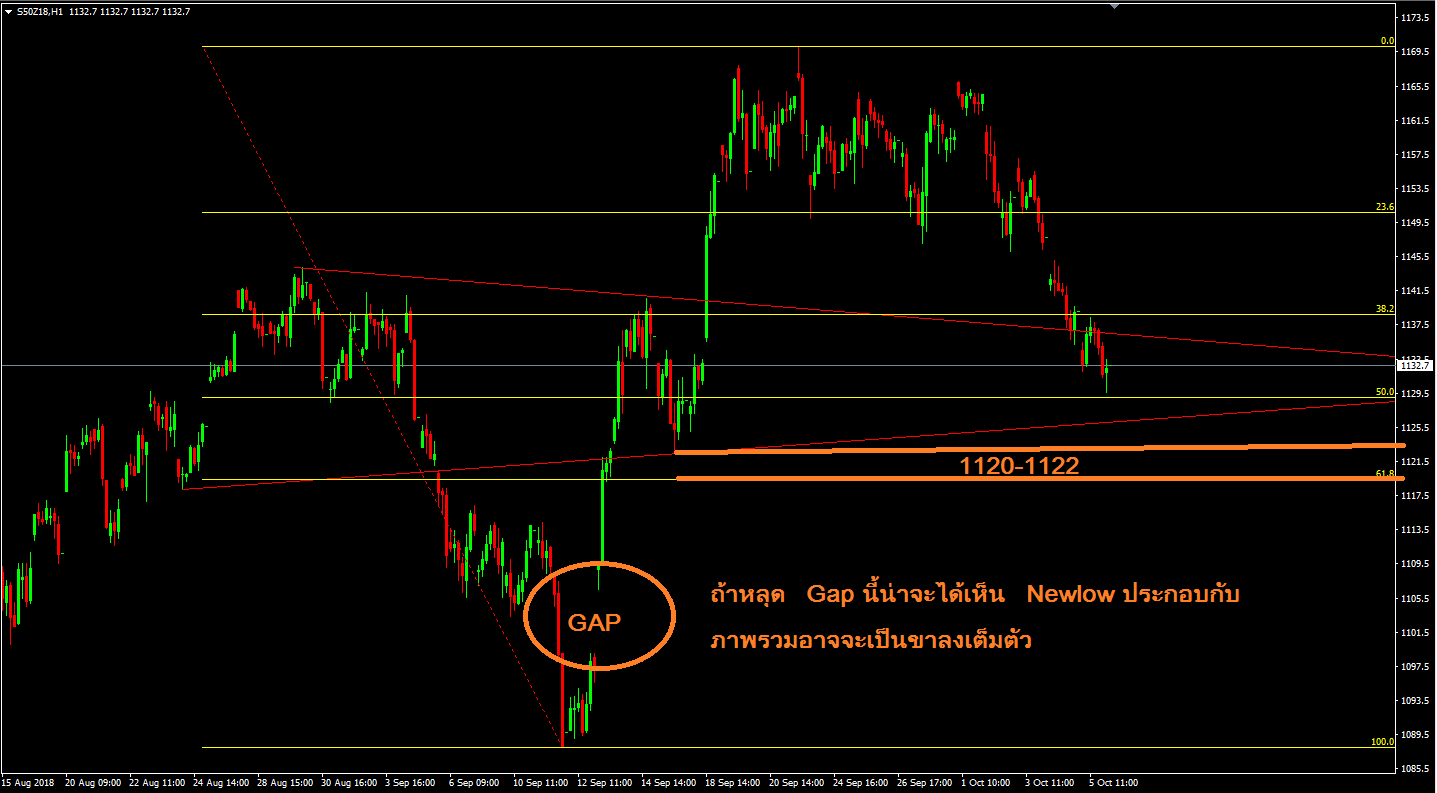 Set50 Index : 9/10/2018 (ระยะสั้น) แนวต้าน : 1130-1133 จุดตัดขาดทุน : 1135 วิเคราะห์ : หลังจากมีแรงเทขายมาหลายวันราคา S50Z18 หลุดลงมาเล่นในกรอบขาลงชัดเจน ซึ่งแน