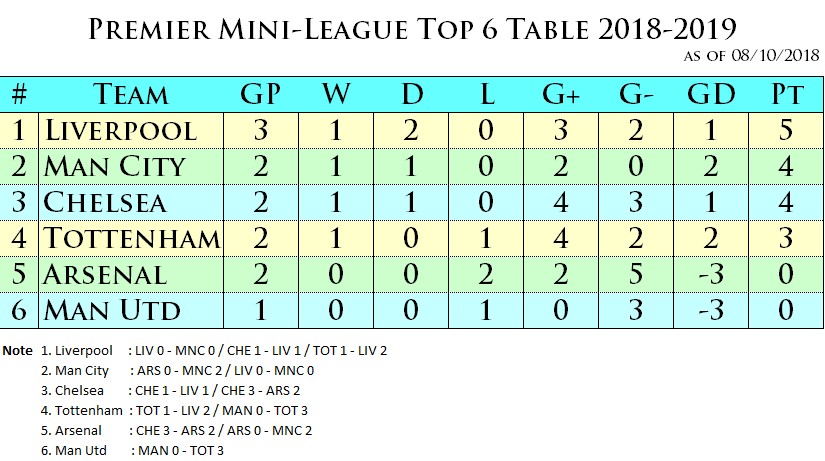ตารางมินิพรีเมียร์ลีก Top 6 อังกฤษ 2018-2019