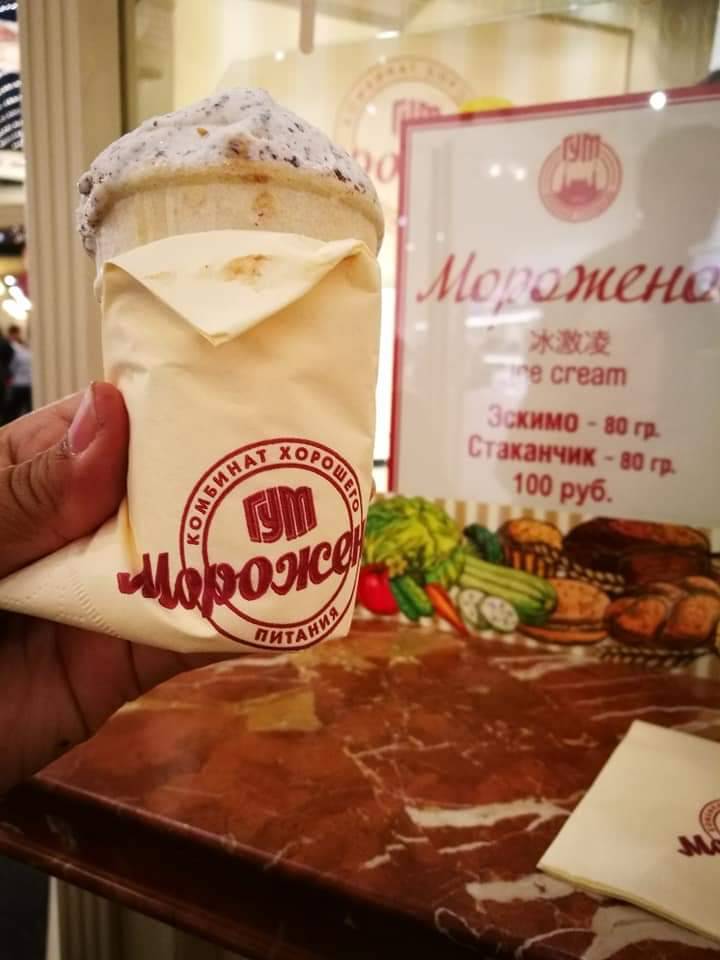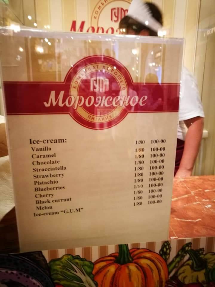 เดินจนเหนื่อยก็แวะเข้าห้างกุม ห้างเก่าแก่ที่สุดของที่นี่ สวยงามอลังการมาก และที่พลาดไม่ได้คือ “ไอติมกุม” มิฉะนั้นถือว่ามาไม่ถึงห้างกุม ต้องยอมรับว่า ไอติมเค้าอร่อยสมเป็นเอกลักษณ์จริง ๆ แนะนำเลยค่ะ ราคา 100 รูเปิ้ล เดินไปมาสักพัก น้องในทีมอยากเข้าห้องน้ำ เดินหาห้องน้ำฟรีในห้างกัน หาเท่าไหร่ก็ไม่เจอ เอ...อ่านรีวิวมาว่าในห้างมีห้องน้ำฟรีนะ คงยกเลิกไปแล้ว จึงตัดใจไปเข้าจ่ายตังค์ 30 รูเปิ้ล เสร็จภาระกิจเอาออก ท้องก็หิว จะกินที่กุมก็ดูจะแพงไป จึงเดินไปดูในห้างด้านหน้าจัตุรัสแดง เป็นห้างที่อยูใต้ดิน โผล่ให้เห็นเฉพาะหลังคาโดม