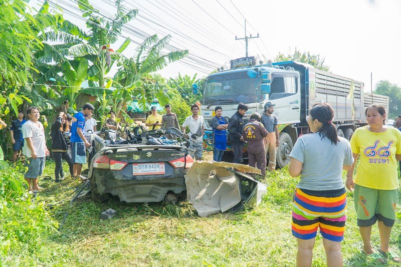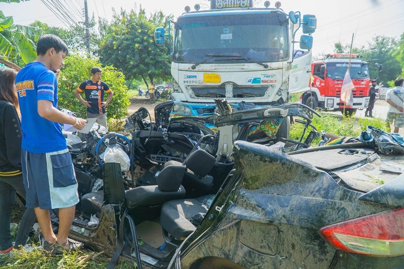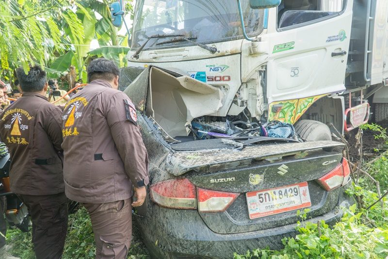 ‘สตั๊นท์แมน’ ควบเก๋ง อัดรถบรรทุกพังยับ เสียชีวิต คาซาก @ กำแพงแสน จ.นครปฐม