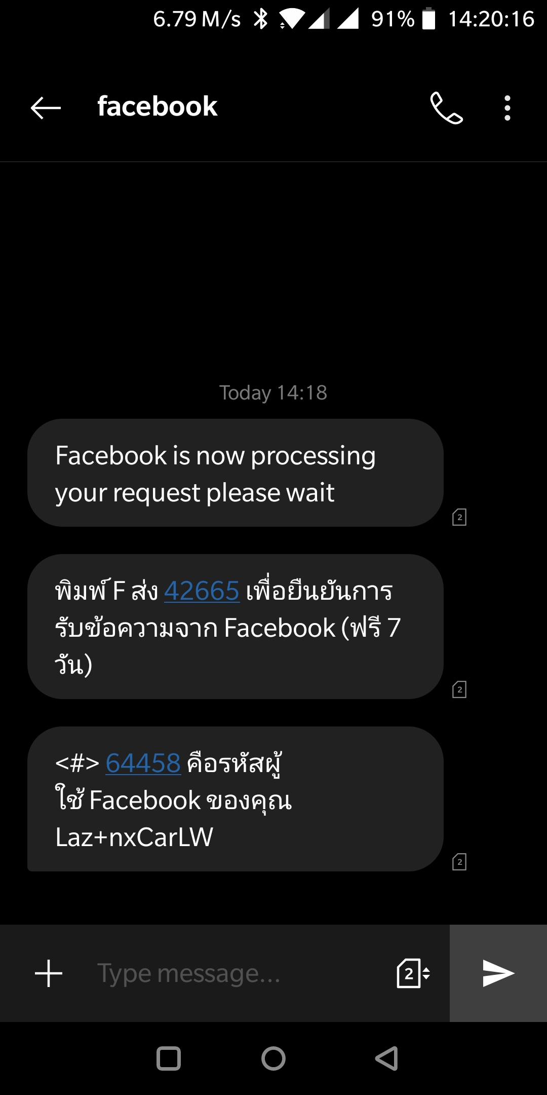 พอดียืนยันหมายเลขโทรศัพท์ด้วยวิธีปกติ แต่ทางfacebookมันไม่ส่งรหัสมาให้สักที เลยใช้วิธีสมัครบริการข้อความที่เสียตังค์อาทิตย์ละ 9 บาท หลังจากสมัครไปแล้ว มันส่งโค้ดมาให้ทางมือถือ 8 หลัก ก็ส่งยืนยันเสร็จ