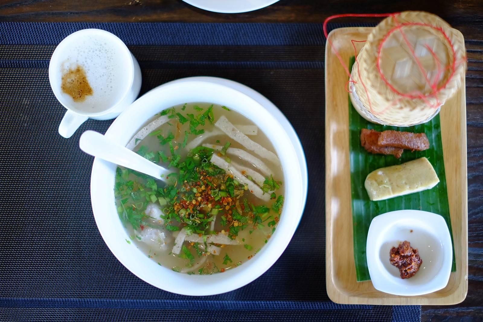 มีข้าวต้ม ก๋วยจั๊บญวน ทำใหม่ทีละถ้วยตามออเดอร์ ส่วนข้าวเหนียวหมูทอด หมูยอ และแจ่ว เป็นบริการพิเศษจากโรงแรม ถ้าอร่อยมีให้ซื้อกลับด้วย ซึ่งอร่อยจริงๆด้วยอ่ะ ซื้อค่าาาา 555+