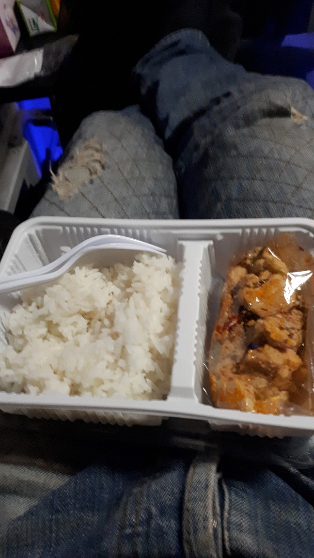 กว่ารถจะออกก็ปาเข้าไปสี่ทุ่ม ขึ้นไปนั่งก็ได้รับแจกข้าวกล่องและขนม แอบถูกใจบัสโฮสเตสเครื่องแบบหน้ารัก
