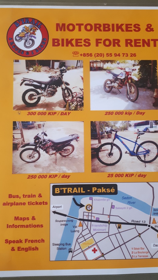 กว่าจะผ่านขั้นตอนการตรวจคนเข้าเมืองก็บ่ายโมง แอบดีในเราเสียค่าธรรมเนียมแค่ 40 บาท เห็นคนอื่นมารีวิวว่าโดนไปคนละ 200 บาท สงสัยหน้าตาเหมือนคนพื้นที่ ถึงปากเซบ่ายสองพอดี ต่อรถเข้าเมือง 80 บาท รีบไปหาร้านเช่ามอเตอร์ไซค์โดยเร็ว พิกัดตามป่ายนี้เพราะต้องการรถวิบาก รีวิวที่ผ่านมาต้องมีการข้ามนำ้และต้องการขี่สำรวจเส้นทางแปลกๆด้วย ราคาถ้าเป็น wave110 วันละ 200บาทถูกมาก แต่รถวิบากวันละ 900บาท แอบปาดเหงื่อนิด