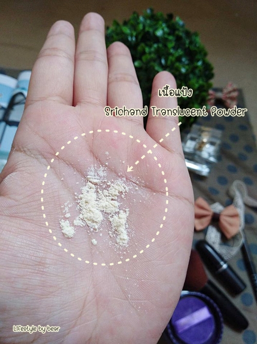 เนื้อแป้งจะเป็นสีขาวครีมไม่มีสี เป็นแป้งโปรงแสง Translucent ใช้ได้กับทุกสีผิว ไม่ทำให้สีรองพื้นเพี้ยนด้วย เนื้อแป้งค่อนข้างละเอียดละมุนกลิ่นอ่อนๆ ออกแนวไทย ตามสไตล์ศรีจันทร์เลยจ้า