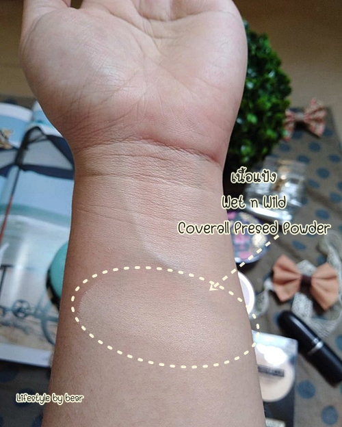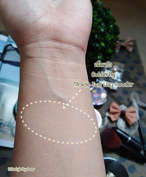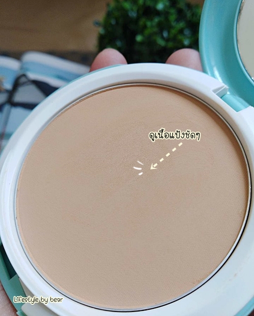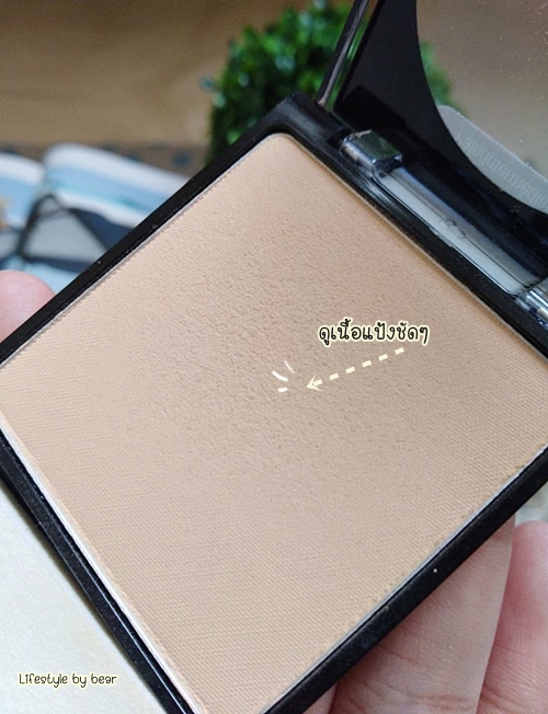 ปาดเนื้อแป้งลงบนผิวให้ดูจะเห็นว่าเค้าจะมีความสว่างเล็กน้อย แต่ยังคงใช้แล้วรอดอยู่จ๊ะ