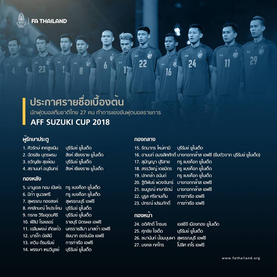สมาคมกีฬาฟุตบอลแห่งประเทศไทย ในพระบรมราชูปถัมภ์ ได้ทำการประกาศรายชื่อนักกีฬาฟุตบอลชายทีมชาติไทยเบื้องต้น 27 คน สำหรับเข้าร่วมแข่งขันฟุตบอลรายการ เอเอฟเอฟ ซูซูกิ คัพ 2018 ระหว่างวันที่ 8 พฤศจิกายน ถึง