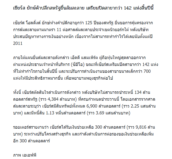 "เซียร์ส" ยักษ์ห้างค้าปลีกสหรัฐล้มละลาย ปิดสาขา142แห่ง....
