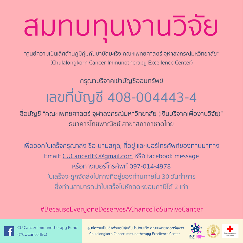 https://www.facebook.com/CUCancerIEC/ หรือเสริชว่า CU Cancer Immunotherapy Fund ช่วยกันคนละนิดละหน่อย เพื่อรักษาชีวิตคนอีกนับล้านครับ (เงินบริจาค inbox ไปขอลดหย่อยภาษีได้ 2 เท่าเลยนะครับ) อย่างไรก็ตามอยากให้เข้าไปอ่านก่อนนะครับ มีบทความที่มีประโยชน์เยอะมาก ขอบคุณทุกท่านที่เข้ามาอ่านครับ
