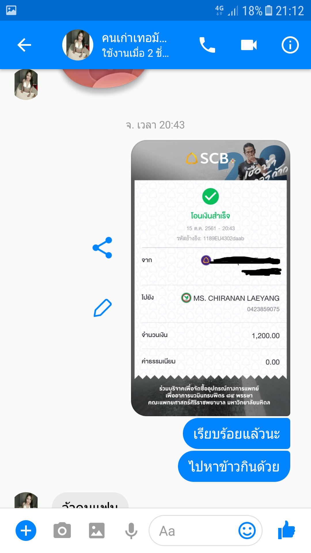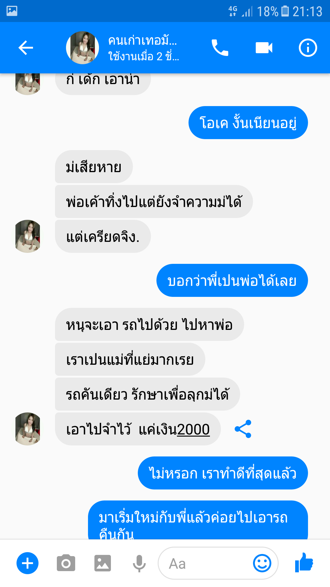 จนวันที่3วันที่ผมรู้ความจริง เธอบอกเธอเอารถพ่อที่เสียไปแล้วไปจำนำกับคนรู้จักเอาเงินมาเลี้ยงลูก2000 ตอนแรกจะมารถตู้ไม่ได้เพราะลูกเค้าติดรถคนนี้มากก็เลยไม่ยอมไป ผมเลยโอนไปอีก2000ค่ารถ เธอบอกจะมาหาผมเย็นนี้แล้วนัดเจอกันอีกที พอหลัง1ทุ่มเธอก็ไม่รับสาย แชทเฟสก็ไม่อ่านไม่ตอบอะไรเลย กว่าจะรู้ตัวว่าโดนหลอก ผมก็หมดไปเยอะแล้ว