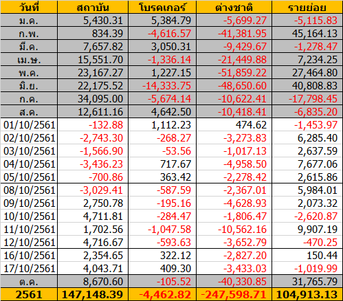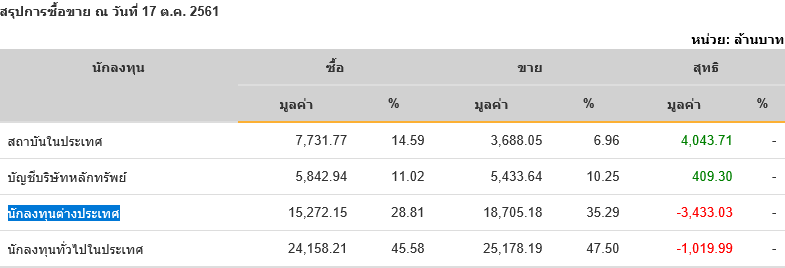 Sinthorn Summary 17/10/2561 : ต่างชาติขายสุทธิ -3,433.03 ลบ.