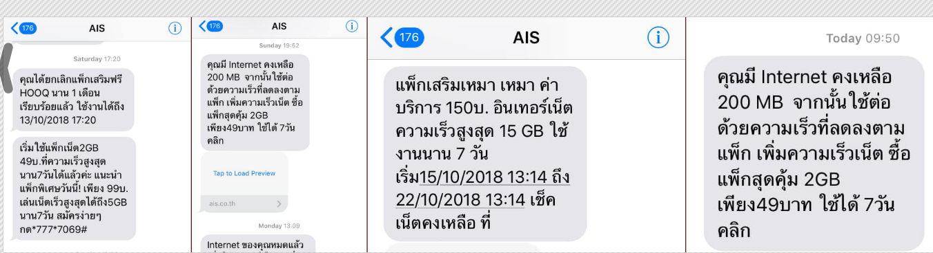วันจันทร์ 15/10/2018 เวลา 13:09 ได้รับแจ้งว่า Internet หมดแล้ว ซื้อเพิ่ม 15 GB