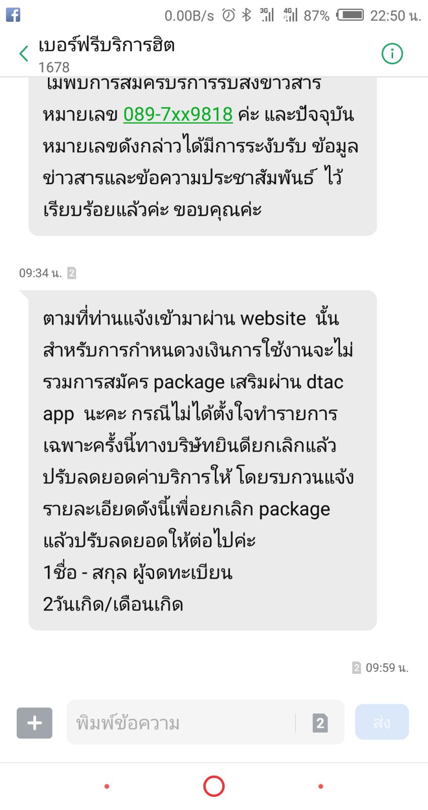 เราก็ดีใจอีกว่าคงยกเลิกให้เรียบร้อยแล้วตามที่เราแจ้งเรื่องไว้พอเวลา10.57ก็มีการโทรมาถามรายละเอียดและให้แคปหน้าจอส่งไปให้ทางdtac community พอเราส่งไปและให้โทรกลับก็เงียบโปรเสริมก็ไม่ได้ยกเลิกส่วนคำตอบก็ไม่ได้เรื่องยอดเกิน. สำหรับผมไม่เสียดายเรื่องเงินส่วนเกิน แต่มันเสียความรู้สึกมากกว่าตอนนี้อยากได้คำตอบเรื่องที่ถามไปวันนี้มากกว่ายังไงก็ติดต่อกลับมาด้วยนะครับหลังไมค์มากะได้วันนี้หลังไมค์ไปหาดีแทคก็ไม่มีตอบกลับใช้ดีแทคมานานจากเติมเงินจนเปลี่ยนมาเป็นรายเดือนไม่เคยคิดเรื่องย้ายค่ายเลยตอนนี้เริ่มมีความคิดอยากย้ายขึ้นมาแล้วถ้าไม่ได้คำตอบที่ชัด้จน