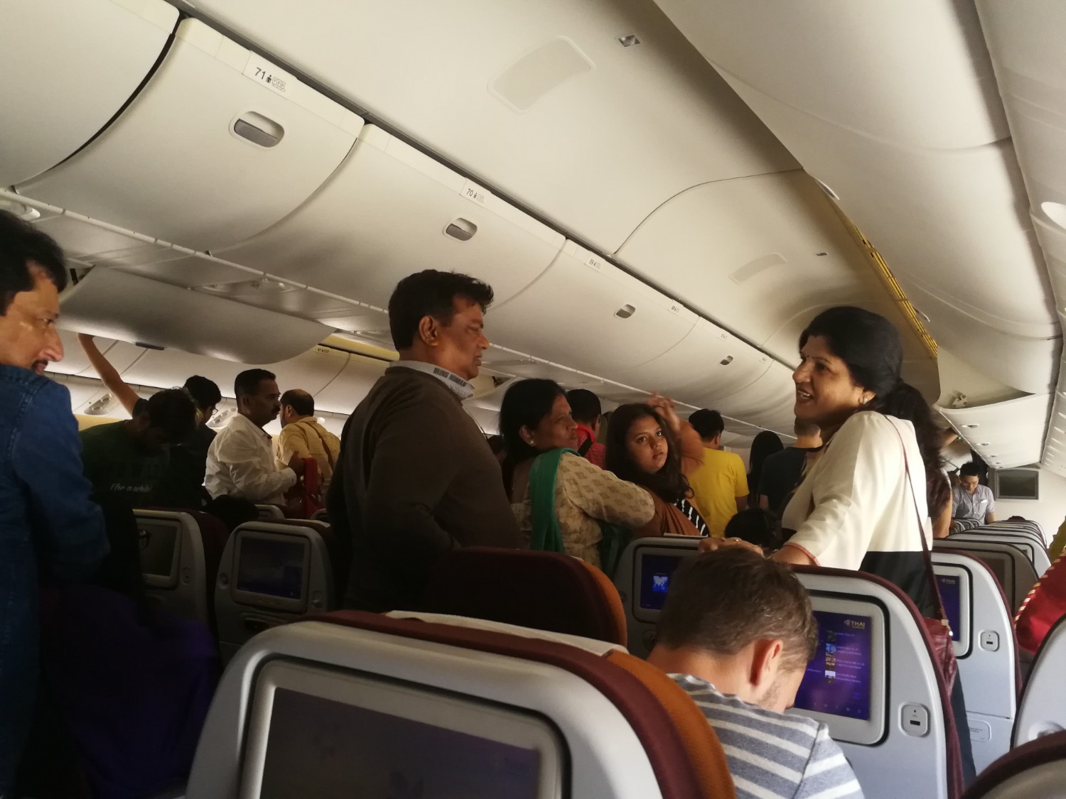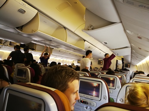 เพราะไม่ชอบการที่ต้องไปยืนรอเพื่อนนักเดินทางเอาสัมภาระไว้บนช่องเก็บสัมภาระ เป็นไปตามคิด เข้าเครื่องเกือบท้ายๆ