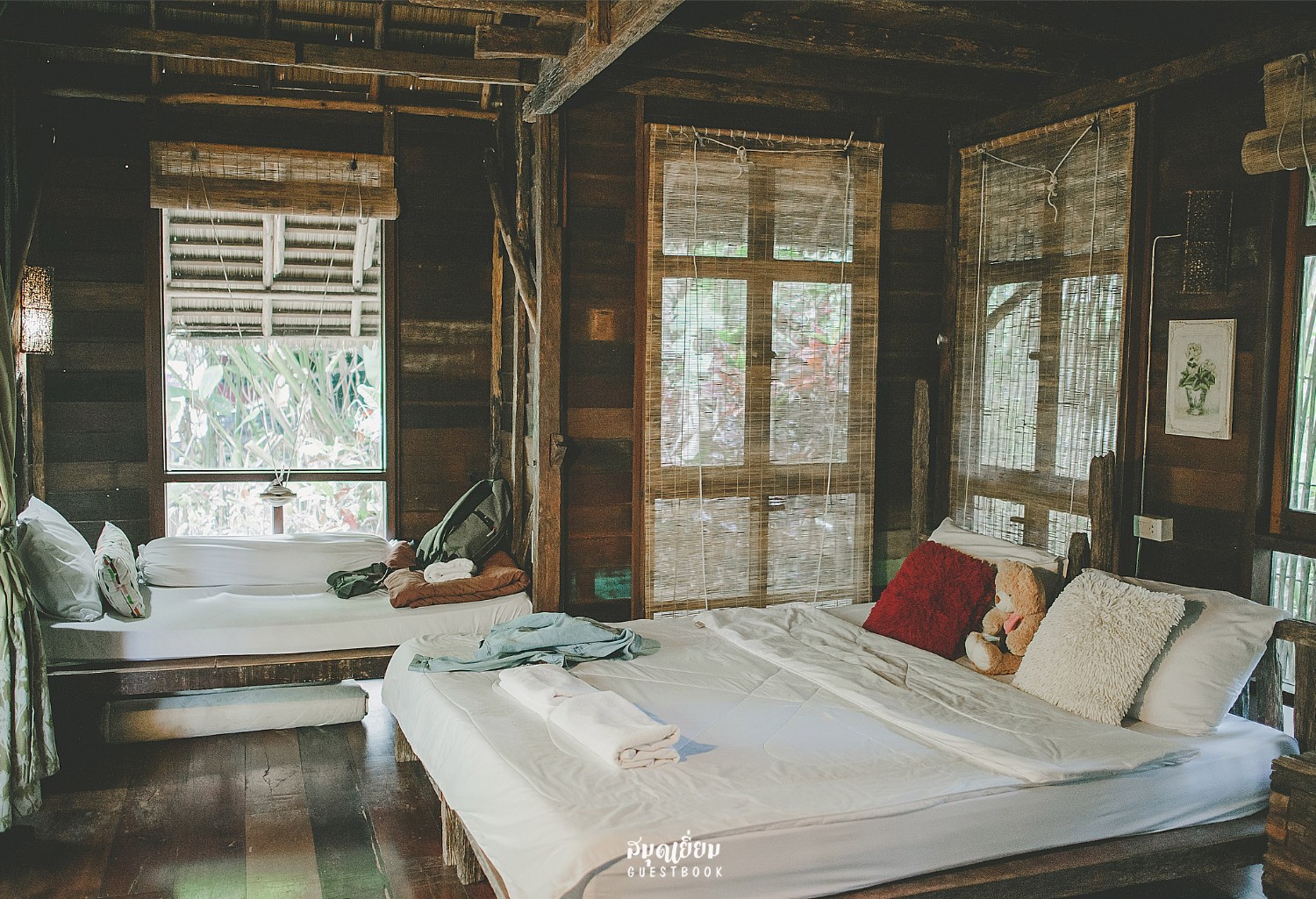 บ้านพักที่บ้านป่าริมธารจะมีหลายราคานะคะ เราพักกระท่อมพริกไทยบ้านพักติดน้ำตกแบบเดินลงบันไดมาก้เล่นน้ำได้เลยก็มี เงียบสงบสะอาดมากนะคะ