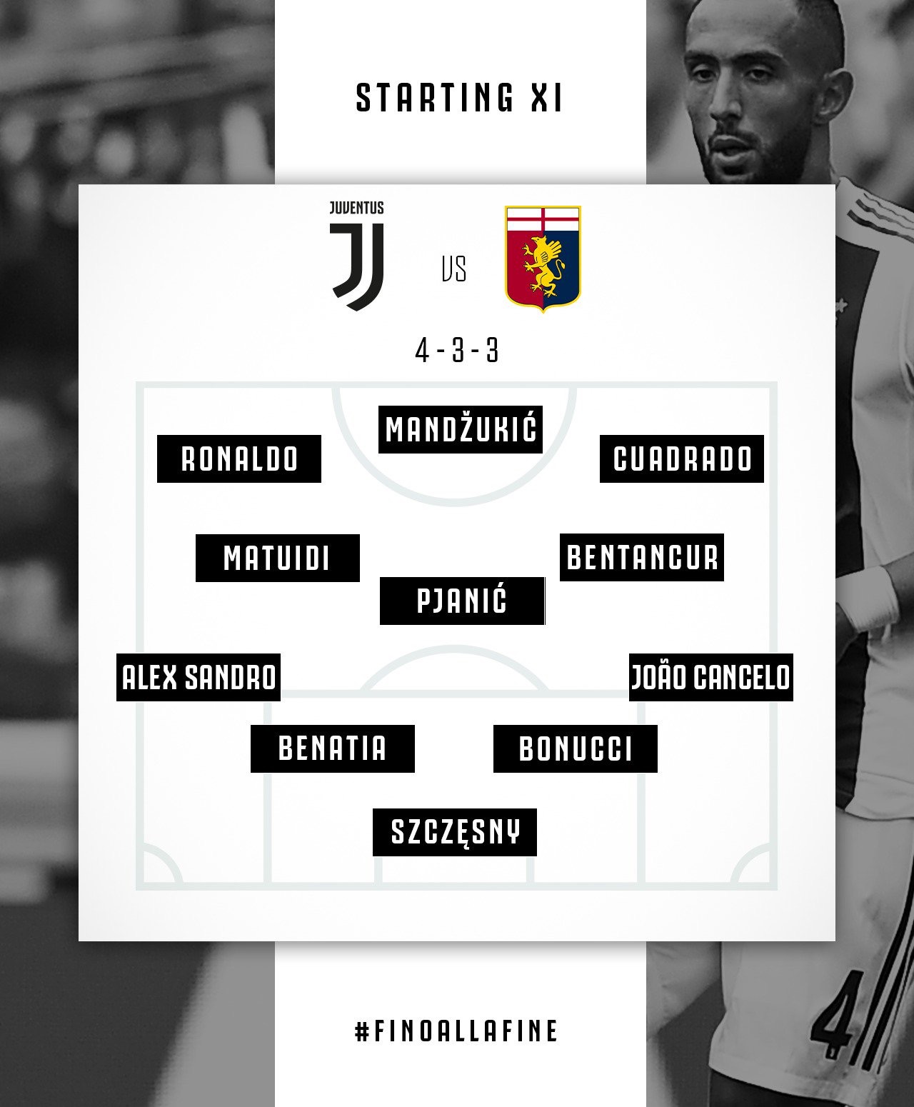 Juventus XI (4-3-3): Szczesny, Cancelo, Bonucci, Benatia, Alex Sandro; Bentancur, Pjanic, Matuidi; Cuadrado, Mandzukic, Ronaldo.