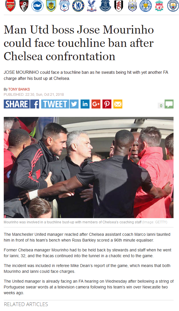 ผู้สื่อข่าวรายงานว่าทั้ง มูรินโญ่ และเอียนนี่ นอกจากจะถูกสโมสรต้นสังกัดลงโทษโดยการหักค่าจ้างแล้วยังจะถูก FA ตั้งข้อหาและทำการไต่สวนเอาผิดเพราะเป็นพฤติกรรมที่ไม่เหมาะสม ก่อนหน้านี้ไม่กี่วัน มูรินโญ่ ก็ถูกไต่สวนหลังจากที่ได้กล่าวคำสบถเป็นภาษาโปรตุเกสหน้ากล้องโทรทัศน์ในเกมพลิกนรกยิงแซง นิวคาสเซิล จนเอาชนะไปได้เมื่อสองสัปดาห์ก่อนเคสนั้นกำลังอยู่ระหว่างให้ มูรินโญ่ ไปรับทราบคำส่ง แต่ก็มาเกิดเคสใหม่เพิ่มขึ้นมาอีกจึงส่อเค้าว่าจะโดนแบนติดต่อกันยาวๆ หลายนัด