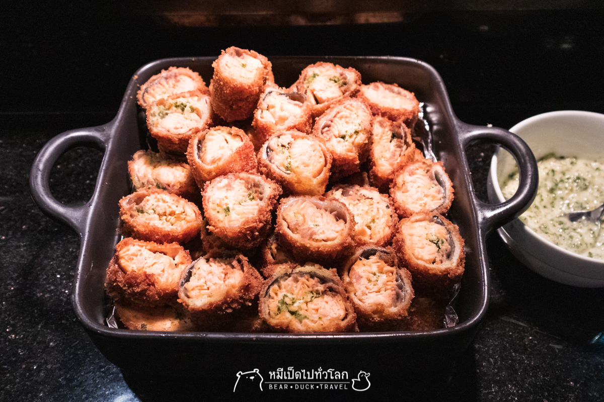 แซลมอนห่อแป้งทอด รสชาติโอเค แต่ข้อเสียของอาหารที่บาร์ คือไม่มีระบบอุ่นที่ดี