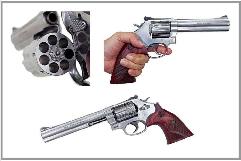 ปืนลูกโม่ ด้วยรูปแบบการทำงานของตัวปืนที่ดัดแปลงให้ยิงเร็วไม่ได้, จำนวนกระสุนที่จำกัด และโดยเฉพาะอย่างยิ่งเมื่อใช้ลำกล้องยาวพกซ่อนยาก ไม่เคยอยู่ในข่ายที่จะถูกห้ามเข้มงวด ตัวอย่างคือนายแบบของสัปดาห์นี้ ที่เป็นลูกโม่รุ่นยอดนิยม โมเดล 686 ของ สมิธ ตัวพื้นฐานของรุ่นพิเศษ โปรซีรีส์ SSR ที่ลงในสัปดาห์ที่แล้ว ชื่อรุ่นสลักไว้บนโครงเหมือนกันคือ 686-6 มาพร้อมโม่ 7 นัด โรงงานเรียกว่า Magnum Plus ใส่ด้ามไม้แกะลายพิเศษสำหรับ Talo Distribution เสนอขายในชื่อ Talo Special Edition