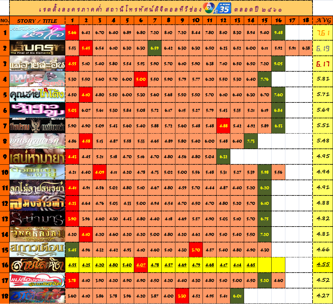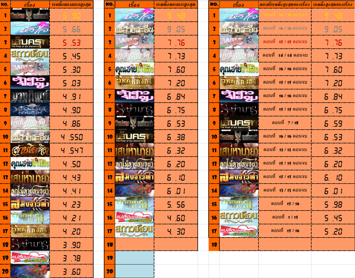 ** หมายเหตุ ** พื้นหลังสีเหลือง = ละครที่กำลังออกอากาศอยู่ /// พื้นหลังสีแดง = เรตติ้งที่ต่ำสุดของเรื่อง /// พื้นหลังสีเขียว = เรตติ้งที่สูงสุดของเรื่อง ขอบคุณ ข้อมูลเรตติ้งโดย ==> Twitter : หนูม