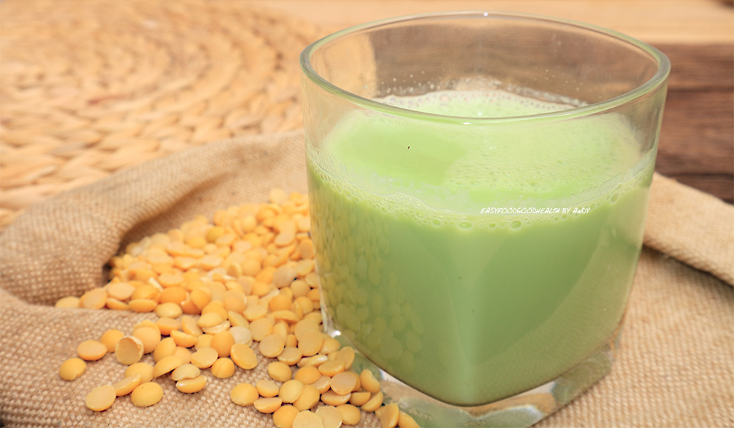 3.นำถั่วเหลืองที่แช่ครบ6ชม.ไปปั่นใส่น้ำใบเตยไป3ถ้วยตวง(อัตราส่วนน้ำ1:6)แล้วนำมากรองด้วยผ้าขาวบางหรือตะแกรงตาถี่ ให้เหลือแต่น้ำ