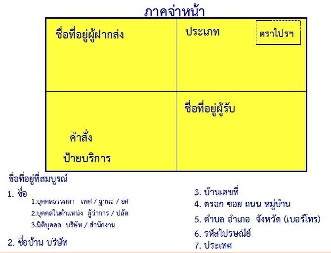 ศูนย์บริการลูกค้าไปรษณีย์ 1545 ต้องขออภัยเป็นอย่างยิ่งและขอน้อมรับข้อเสนอแนะอันเป็นประโยชน์จากท่านในการปรับปรุงคุณภาพการให้บริการให้ดียิ่งขึ้นต่อไปครับ ตามปกติแล้วเนื่องจากสิ่งของมีจำนวนมากในเบื้องต้นเจ้าหน้าที่จะดำเนินการคัดแยกสิ่งของโดยดูจากรหัสไปรษณีย์ที่อยู่มุมขวาล่างเบื้องต้นครับ ซึ่งการจ่าหน้าที่ถูกต้อง ข้อมูลที่อยู่ผู้ส่งจะต้องอยู่มุมบนซ้าย และจ่าหน้าข้อมูลที่อยู่ของผู้รับจะอยู่ด้านมุมขวาล่างของกล่อง/ซอง กรณีที่ระบุข้อมูลจ่าหน้าผู้ส่ง/ผู้รับไว้คนละด้าน อาจจะทำให้เกิดความสับสนในส่วนของการคัดแยกครับ สิ่งของจึงอาจจะถูกตีกลับคืนหาผู้ส่งตามจ่าหน้า ท่านสามารถดูตำแหน่งในการจ่าหน้าที่ถูกต้องได้ตามไฟล์ภาพที่แนบมาพร้อมกันนี้ อย่างไรต้องขออภัยในความไม่สะดวกที่เกิดขึ้นเป็นอย่างสูงมา ณ โอกาสนี้ด้วยครับ