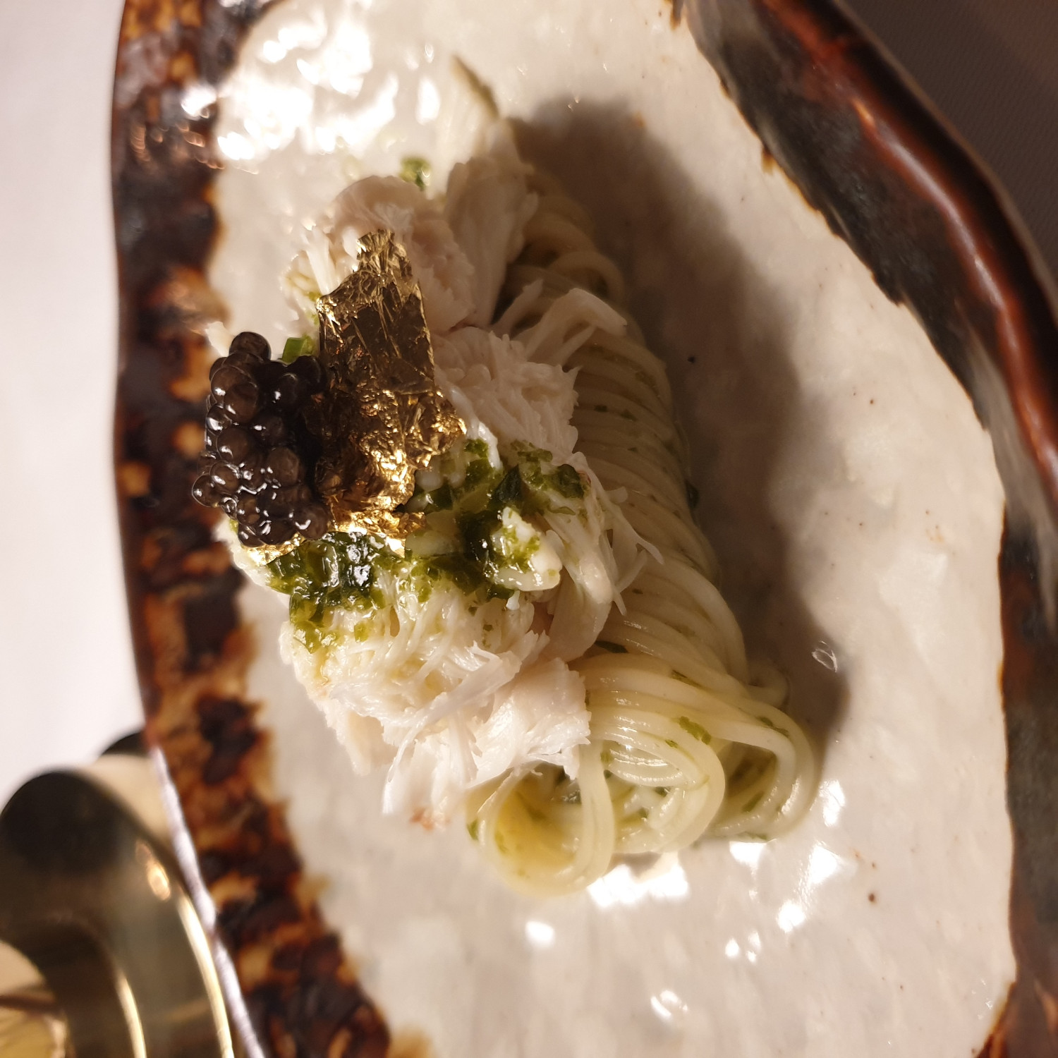 Small Plate สั่งมาลอง 4 ตัว คือ Crab Capellini, Beef Sukiyaki & soy sauce cured egg yolk, Lettuce กับซอสแอนโชวี่ แล้วก็ Beef Tongues