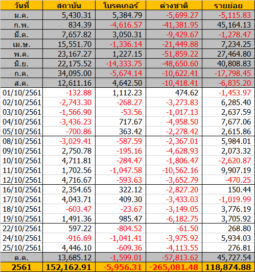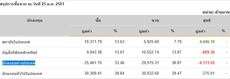 Sinthorn Summary 25/10/2561 : ต่างชาติขายสุทธิ -4,113.55 ลบ.