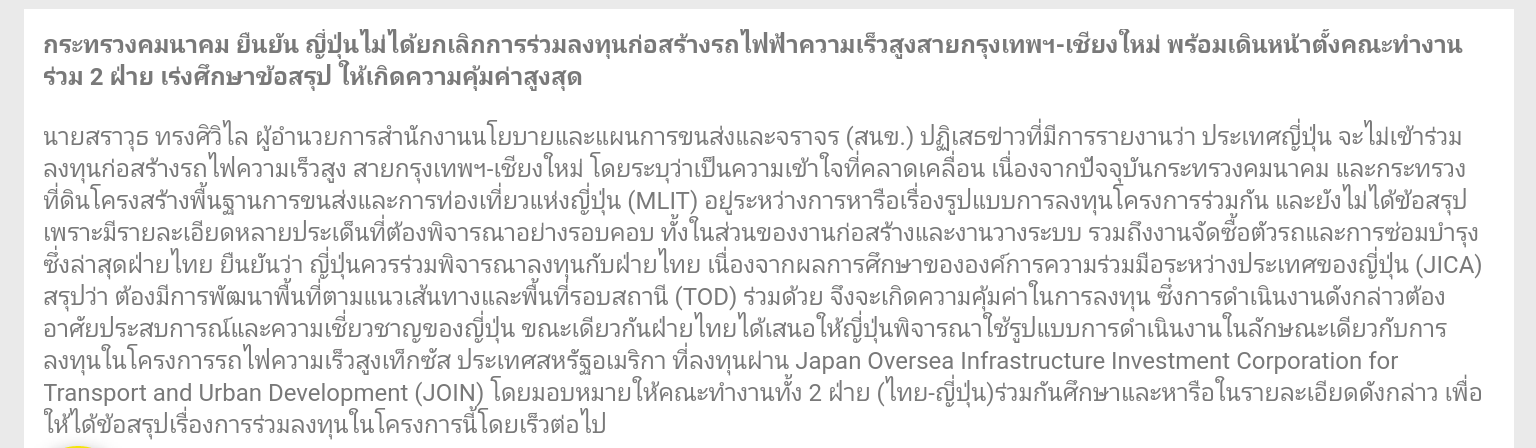 3. การหารือล่าสุดฝ่ายไทยได้เสนอให้ฝ่ายญี่ปุ่นพิจารณาใช้รูปแบบการดำเนินงานในลักษณะเดียวกับการลงทุนในโครงการรถไฟความเร็วสูงเท็กซัส ประเทศสหรัฐอเมริกา (Texas High-Speed Railway Project) เมื่อปี พ.ศ. 2558 ที่ลงทุนผ่าน Japan Oversea Infrastructure Investment Corporation for Transport and Urban Development (JOIN) โดยมอบหมายให้คณะทำงานทั้ง 2 ฝ่าย (ไทย-ญี่ปุ่น) ร่วมกันศึกษาและหารือในรายละเอียดดังกล่าว เพื่อให้ได้ข้อสรุปเรื่องการร่วมลงทุนในโครงการนี้โดยเร็วต่อไป