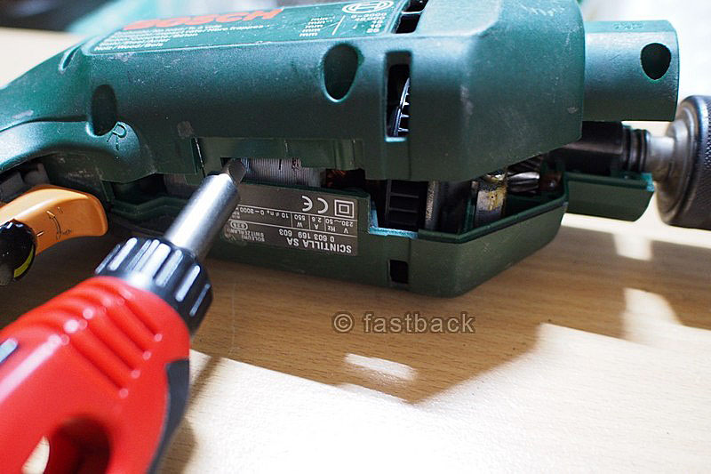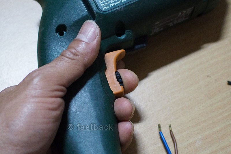 ปิดเปลือกสว่าน ยังไม่ต้องใส่สกรู เสียบปลั๊กไฟ ลองกดดูว่าสว่านทำงานหรือเปล่า