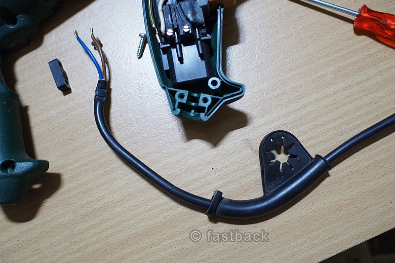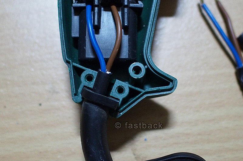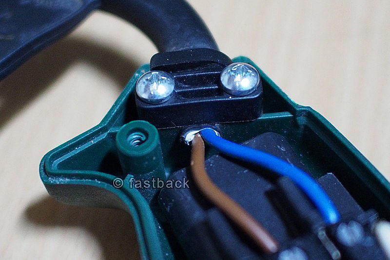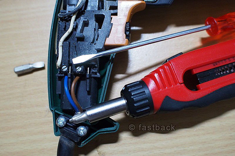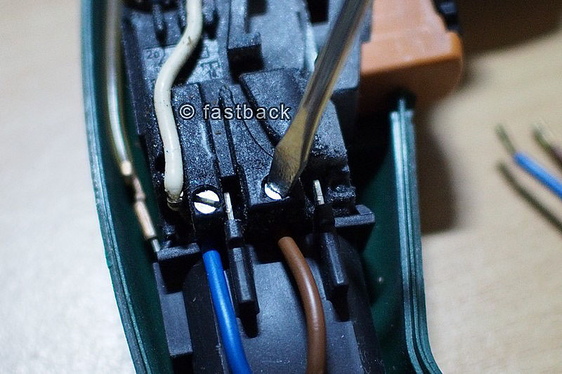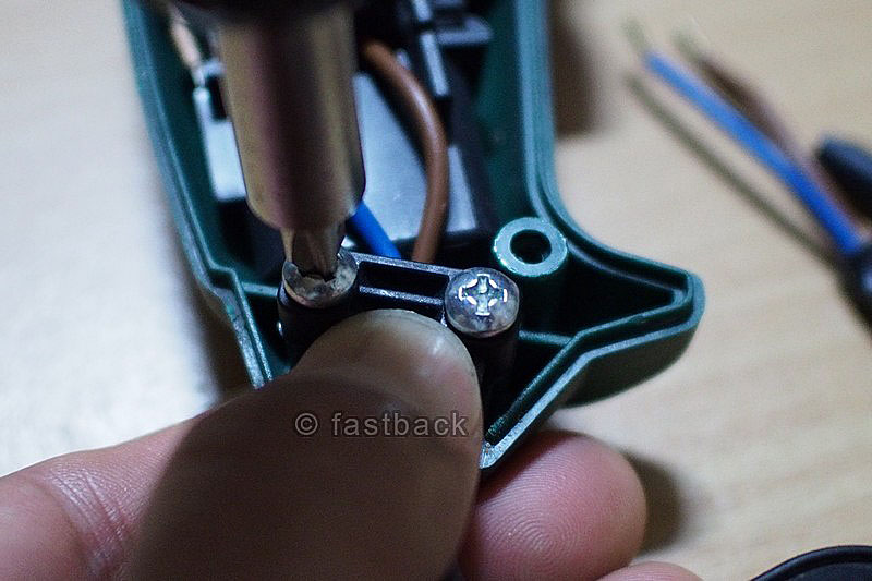 เราก็ถอดปลั๊กไฟ เปิดเปลือกสว่านออก อย่าลืมขันย้ำสกรูยึดสายไฟให้แน่นตามเดิม