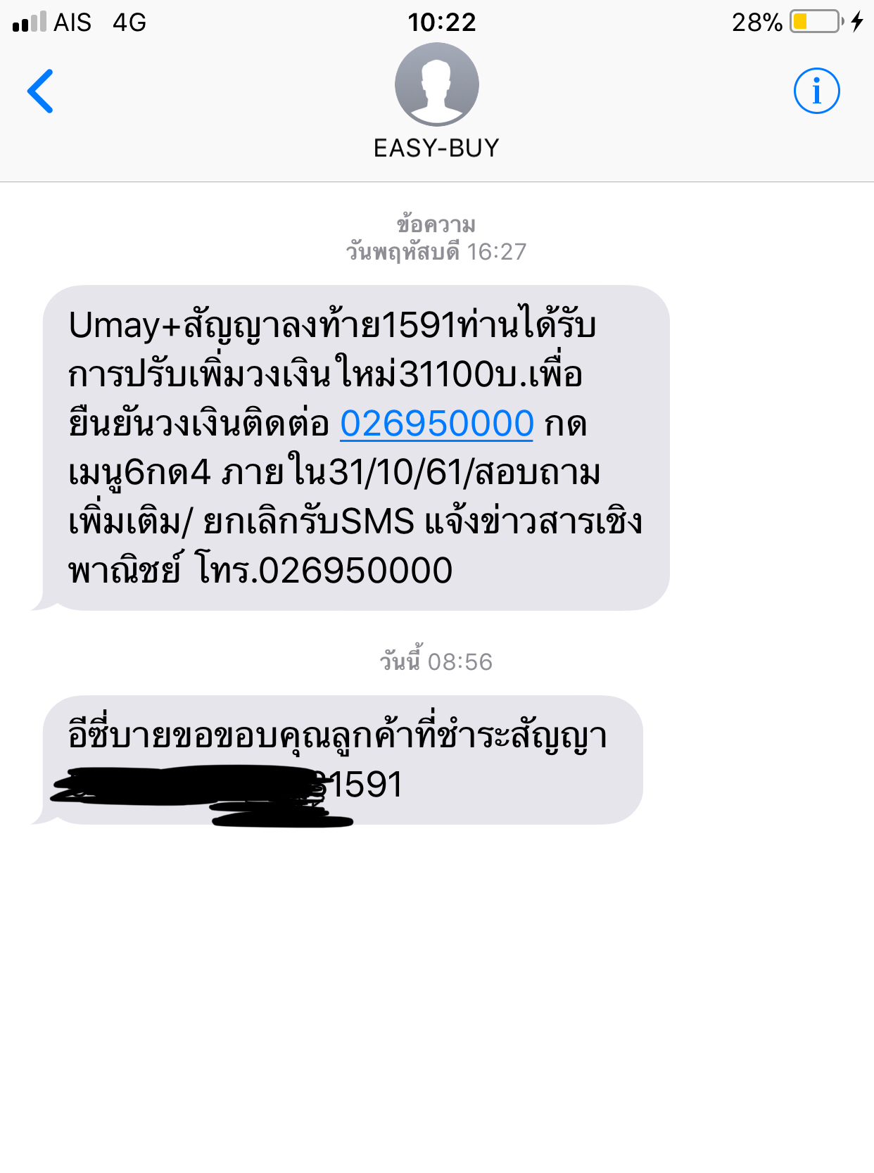 มีข้อความเข้ามาอีก ว่า “ขอบคุณลูกค้าที่ชำระสัญญาหมายเลข xxxx xxxx xxxx 1591..”