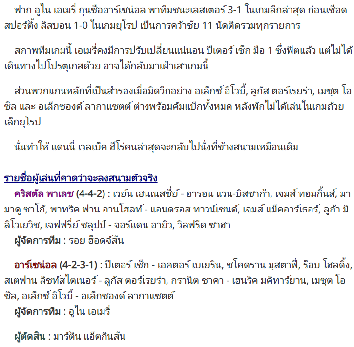 "ปืนใหญ่" อาร์เซน่อล ลุ้นเก็บชัย 12 นัดติดต่อกันรวมทุกรายการโดยมี เมซุต โอซิล พร้อมหนุนล่าตาข่าย เกมบุกถิ่น "ปราสาทเรือนแก้ว" คริสตัล พาเลซ ที่จะสู้เพื่อทำอันดับหนีโซนตกชั้น ในศึกฟุตบอล พรีเมียร์ลีก อังกฤษ คืนนี้ เวลา 20.30 น.