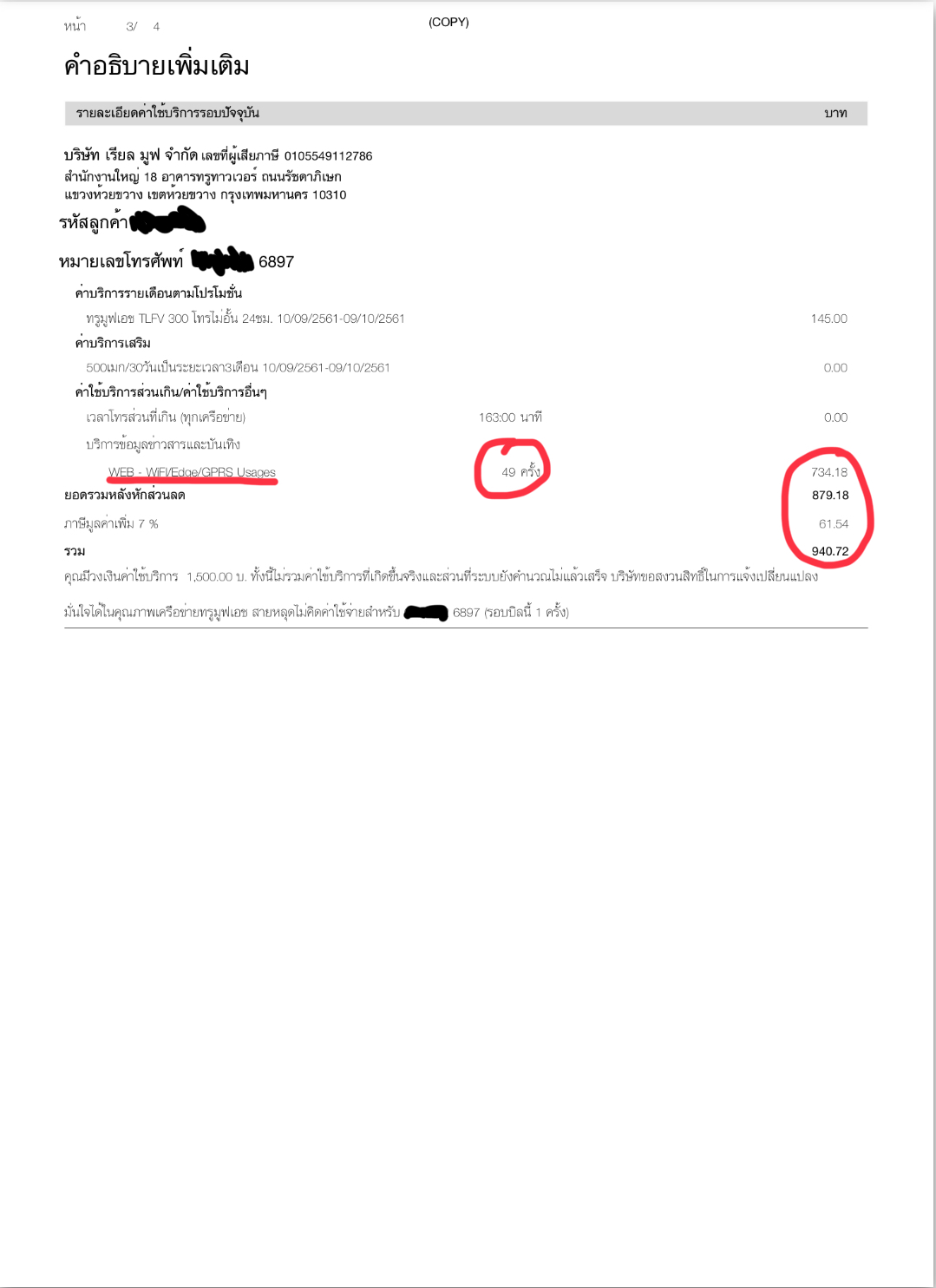 จะเห็นว่ามีค่าใช้บริการ web - WiFI/Edge/GPRS จำนวน 49 ครั้ง รวมเป็นเงิน 940.72 บาท