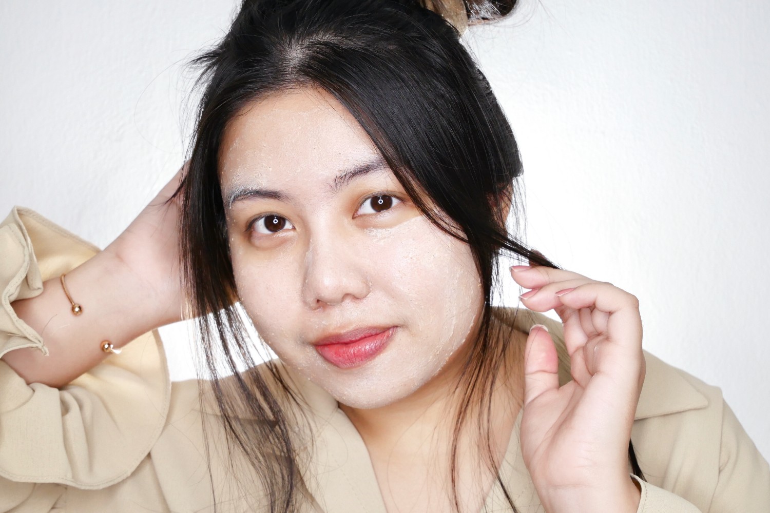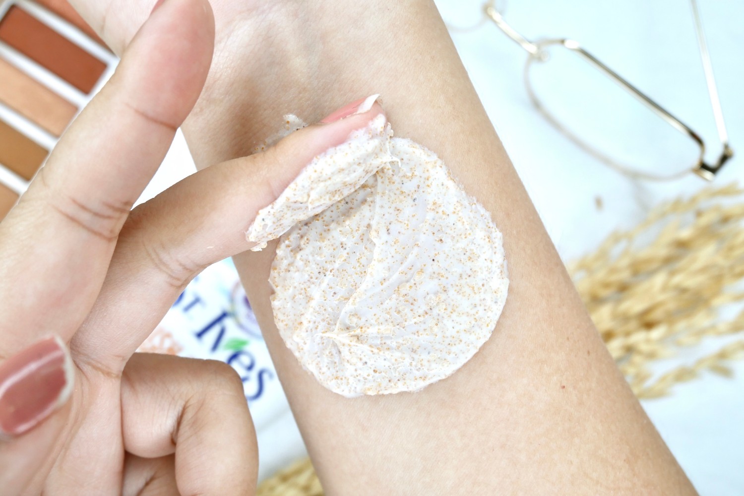 ใช้ขัดและนวดให้ทั่วใบหน้า แล้วล้างออกด้วยน้ำสะอาด