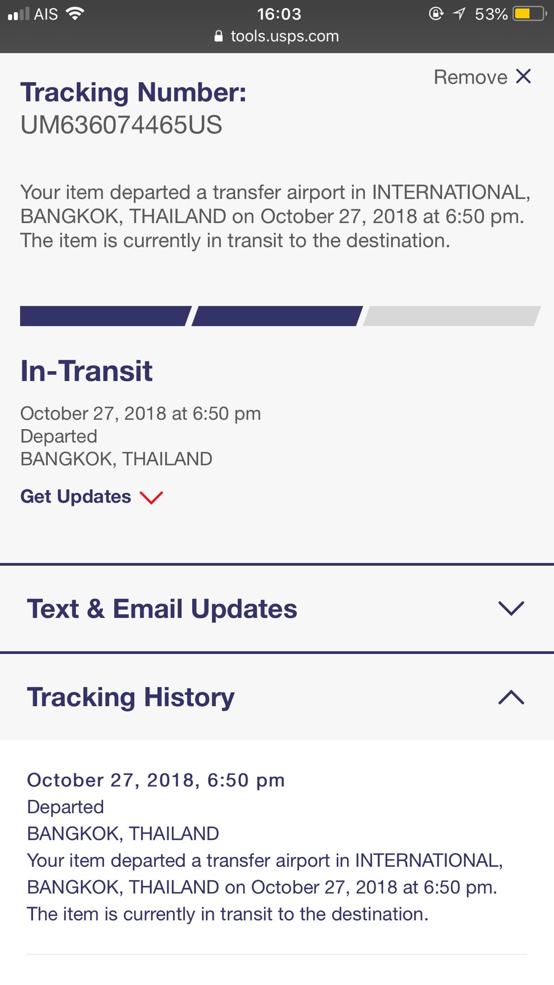 สั่งของจากอเมริกาค่ะ ของเข้าระบบวันที่ 23/10/2018 ของถึงไทยตั้งแต่วันที่27/10/18 ตอนนี้วันที่ 3/11/2018 ก็ยังไม่ได้ของและไม่มีอะไรแจ้งเตือนหรือคืบหน้าเลย