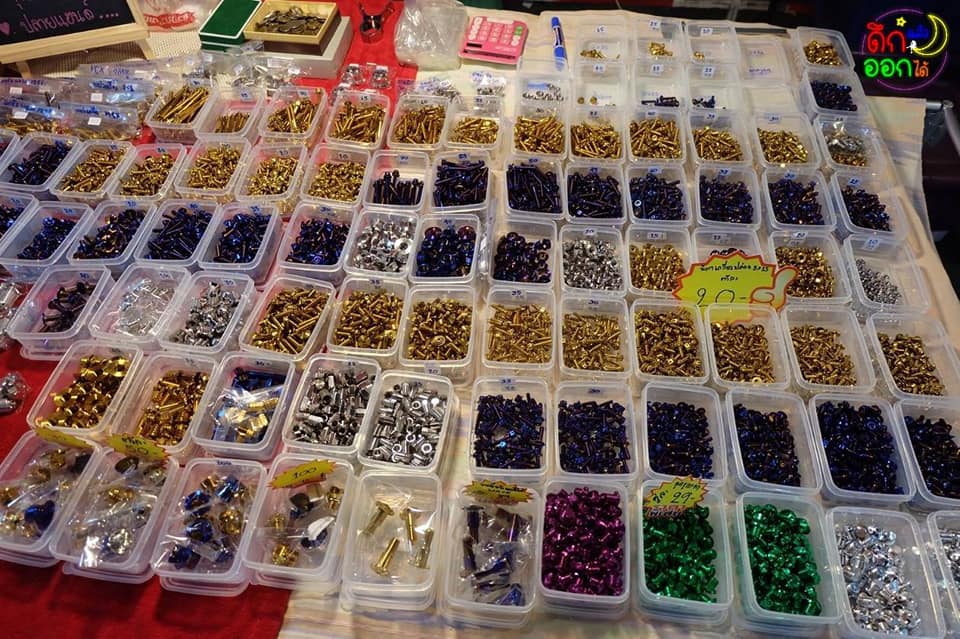 ร้านนี้ห้ามพลาดสำหรับหนุ่มๆที่ชอบแต่งรถมอเตอร์ไซต์ ร้านนี้มีน๊อตอะไหล่มากมายหลายสี ไม่ว่าจะเป็น แคร้งเครื่อง คอนโซล จุกกลม-เหลี่ยม ปลายแฮนด์ ราคาเริ่มต้นเพียง 10.-