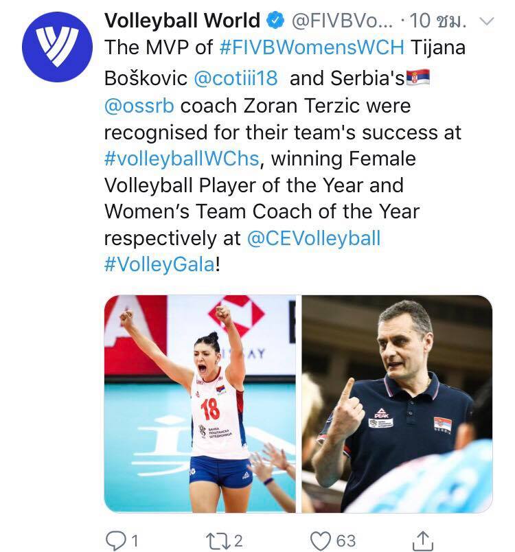ได้รับรางวัล "ผู้เล่นวอลเลย์บอลหญิงแห่งปี" พร้อมกับโค้ช โซรัน เทอซิค