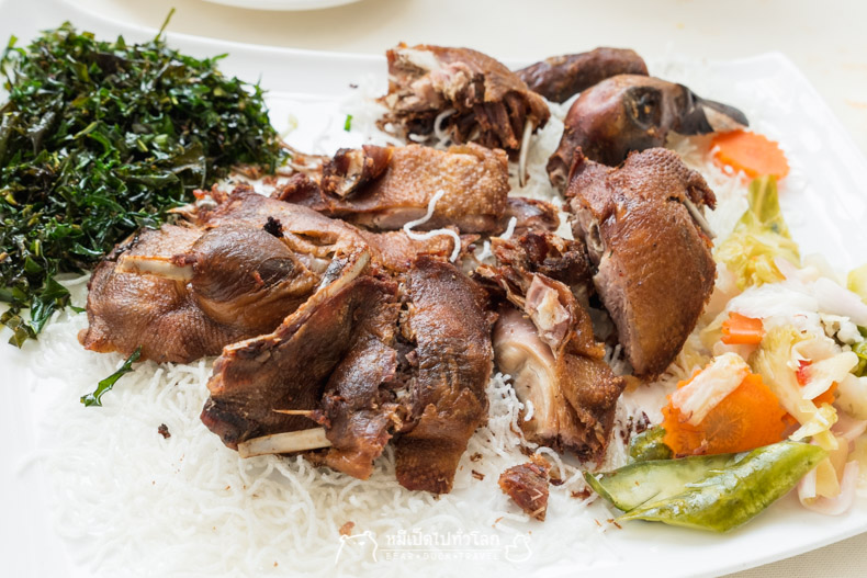เป็ดตุ๋นพะโล้แล้วเอาไปทอดอีกรอบ กรอบนอก เนื้อหนึบๆ สู้ฟัน หอมเป็ดพะโล้ ต้องจับแทะถึงจะสนุก เสิร์ฟกับน้ำจิ้มซีฟู้ดหรือซีอิ้วดำ จานนี้มาตอนที่ผมอิ่มจะแย่ เลยได้แค่ชิมหนึ่งชิ้น ขอโทษนะเจ้าเป็ด แต่เรากินไม่ไหวจริงๆ