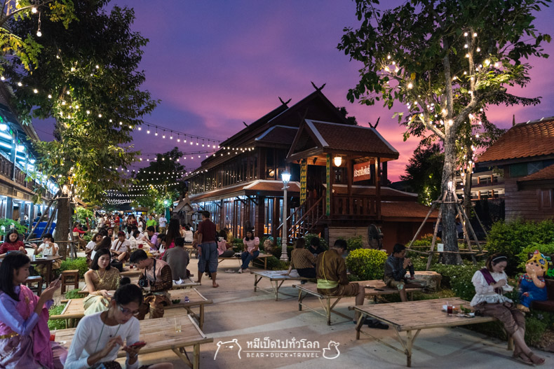 เรากลับมาที่นี่อีกครั้ง พบว่าบ้านเรือนไทยสวยงามขึ้นมากเมื่ออยู่ใต้ท้องฟ้าสีม่วงแดงยามเย็น และไฟประดับวิบวับ รวมกับชุดไทยที่ชาวคณะใส่มาร่วมงาน ทำให้รู้สึกเหมือนย้อนเวลาได้จริงๆ