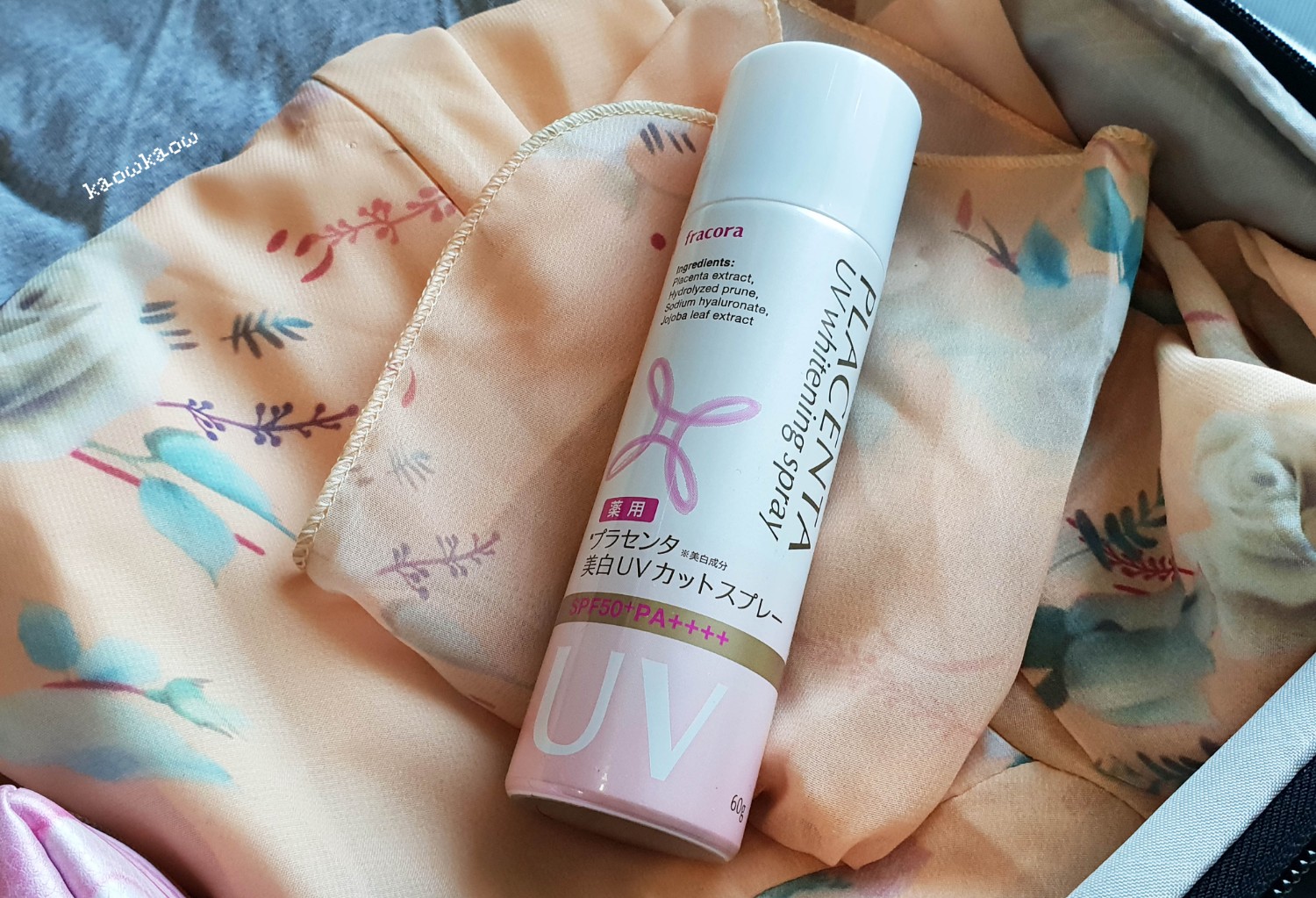 Fracora Placenta UV Whitening Spray เป็นสเปรย์กันแดดของ Fracora ข้าวชอบอันนี้เพราะมีความมโนเวลาฉีดว่า เออ มันผสมรกหมูด้วยวะ นอกจากจะกันแดดแล้วยังได้บำรุงอีกนะยูววว แถมใช้ง่าย ไม่ขาว ไม่เป็นคราบ ไม่มัน ไม่เหนียว ไม่เหนอะ กันแดดได้โอเคด้วย แต่อาจต้องฉีดเยอะนิดนึง