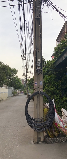 เวลารถที่บ้านผมจะถอยหลังเข้าบ้าน กระจกมองข้างฝั่งคนขับเกือบจะเกี่ยวเจ้ากับสายนี้หลายครั้งแล้วครับ ถนนหน้าตึกแถวนี้มันแคบมาก แล้วก็ถ้าตกค่ำมันก็จะมืด