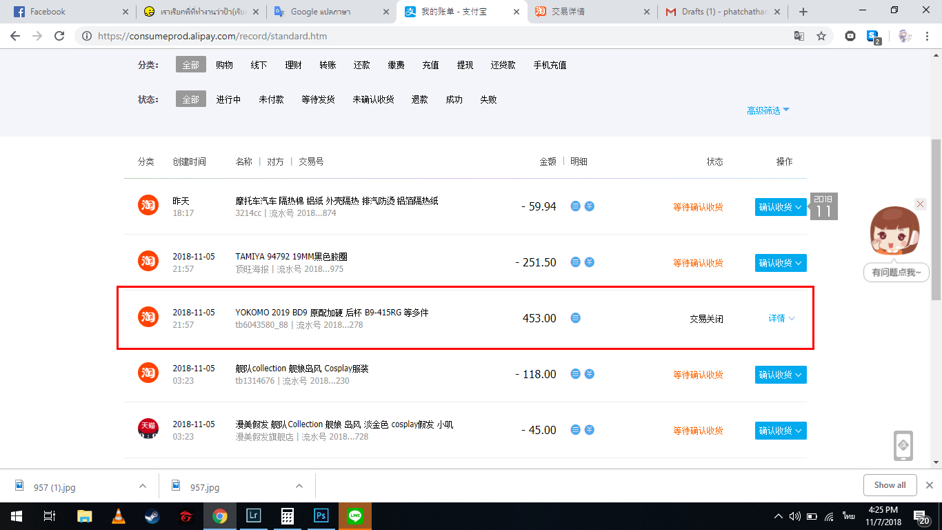 จำนวน ¥453+ค่าทำเนียมรายการ Alipay 3.0% = 2,262.96฿ (เรท 4.85 ณ วันที่ชำระ)