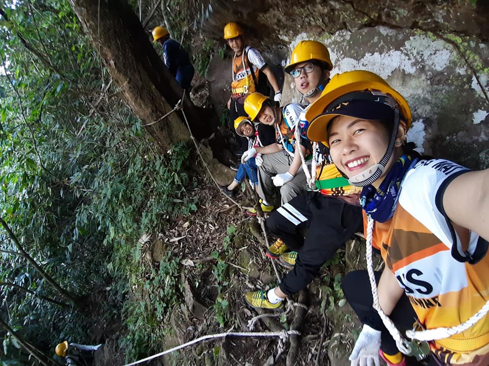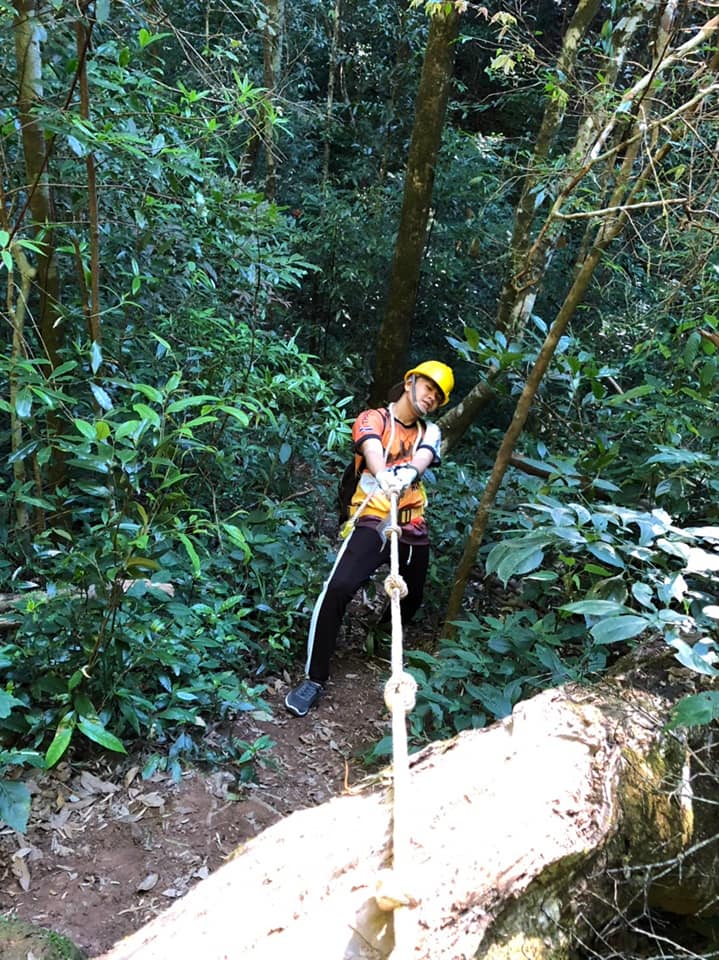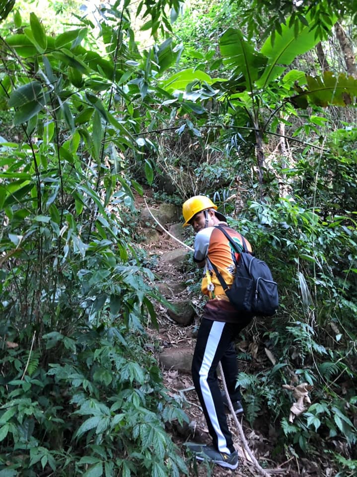 เดินไปประมาณ1กิโล ก็จะถึงเขาที่จะขึ้นไปจุดสูงสุด พอเดินเข้าไป นี่เป็นป่าจิงๆ มีทางเดินนะ แต่แบบมีต้นไม้ปกคุมตลอดทาง ไม่เหมือนทางที่เราเดินขึ้นลานสน ตอนนั้นที่เราเดินก็คิดว่า ละครอังกอร์ ยังไม่เดินป่าทึบเท่าเราเลย555 เดินไปสักพัก เริ่มบ่นกันเขาให้เราใส่อุปกรณ์พวกนี้ทำไมกัน หลังจากเราบ่นไม่นานมาถึงจุดเริ่มปีนเขาแค่นั้นแหละ พระเจ้า ปีนจิงๆ เนินเขาแบบจะถึง90องศา มีเชือกให้จับเดิน ตลอดทาง